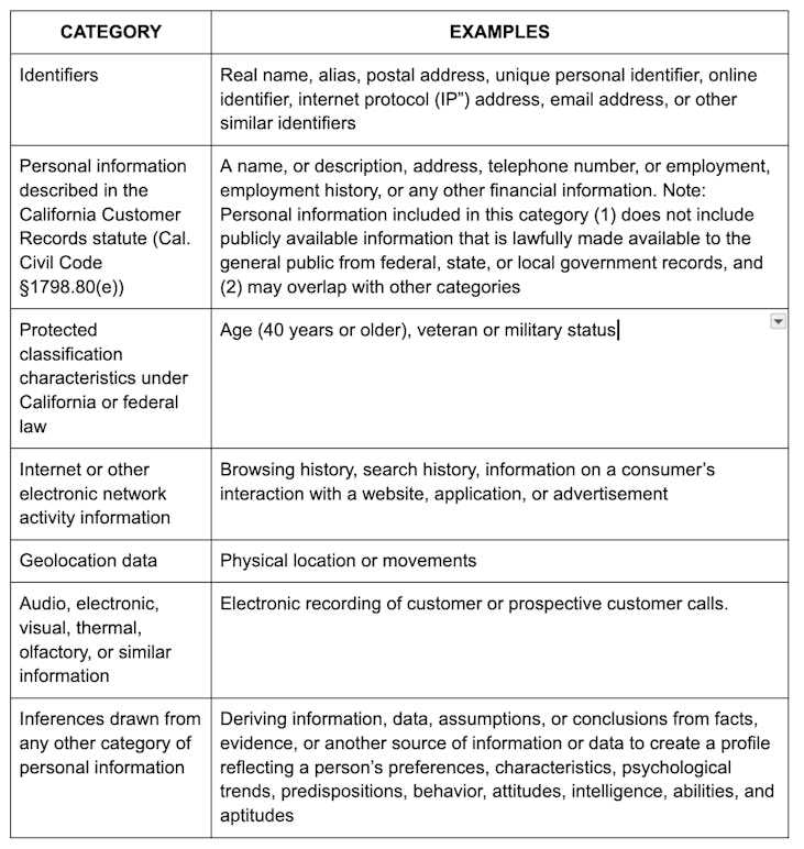 - The information outlined in this Notice about our Privacy Policies and CCPA Privacy Rights does not cover the Personal Information we collect, use, or disclose pertaining to:
